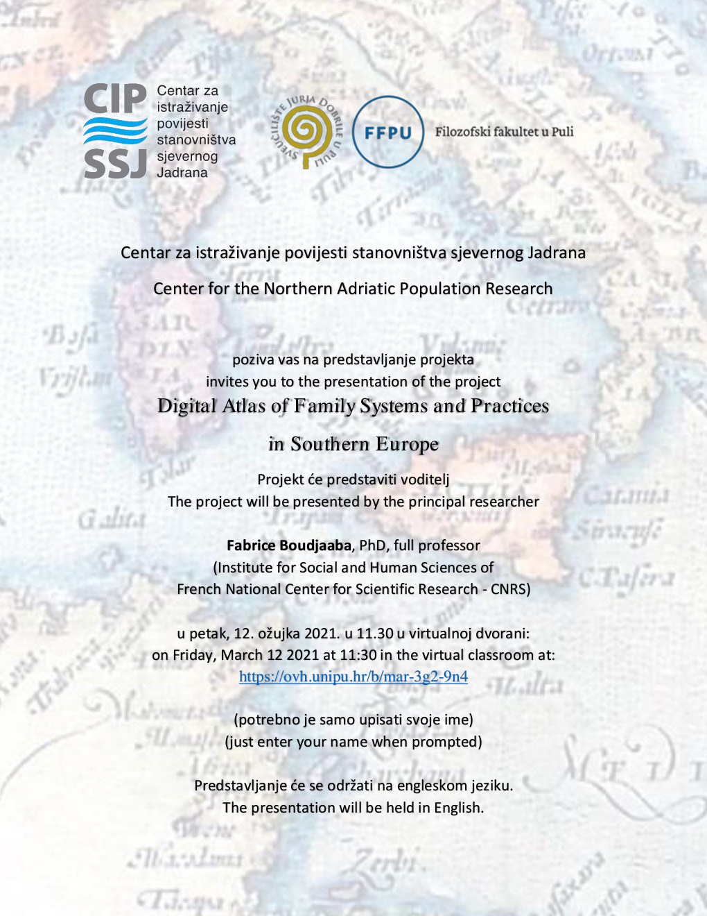 Projekt će predstaviti voditelj Fabrice Boudjaaba, PhD, full professor (Institute for Social and Human Sciences of French National Center for Scientific Research - CNRS) u petak, 12. ožujka 2021. u 11.30 u virtualnoj dvorani: