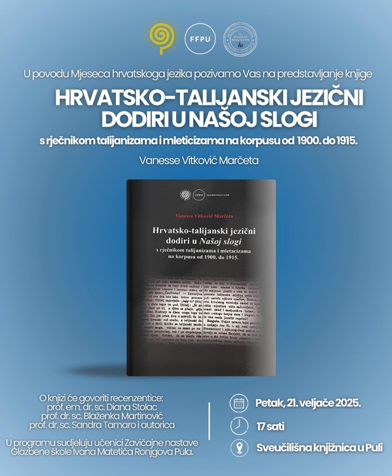 Otvaramo Mjesec hrvatskoga jezika (21. veljače - 17. ožujka) predstavljanjem knjige dr. sc. Vanesse Vitković Marčeta Hrvatsko-talijanski jezični dodiri u Našoj slogi s rječnikom talijanizama i mletacizama na korpusu od 1900. do 1915. te započinjemo i obilježavanje 30 godina Odsjeka za kroatistiku u Puli mjesečnim zbivanjima za javnost.