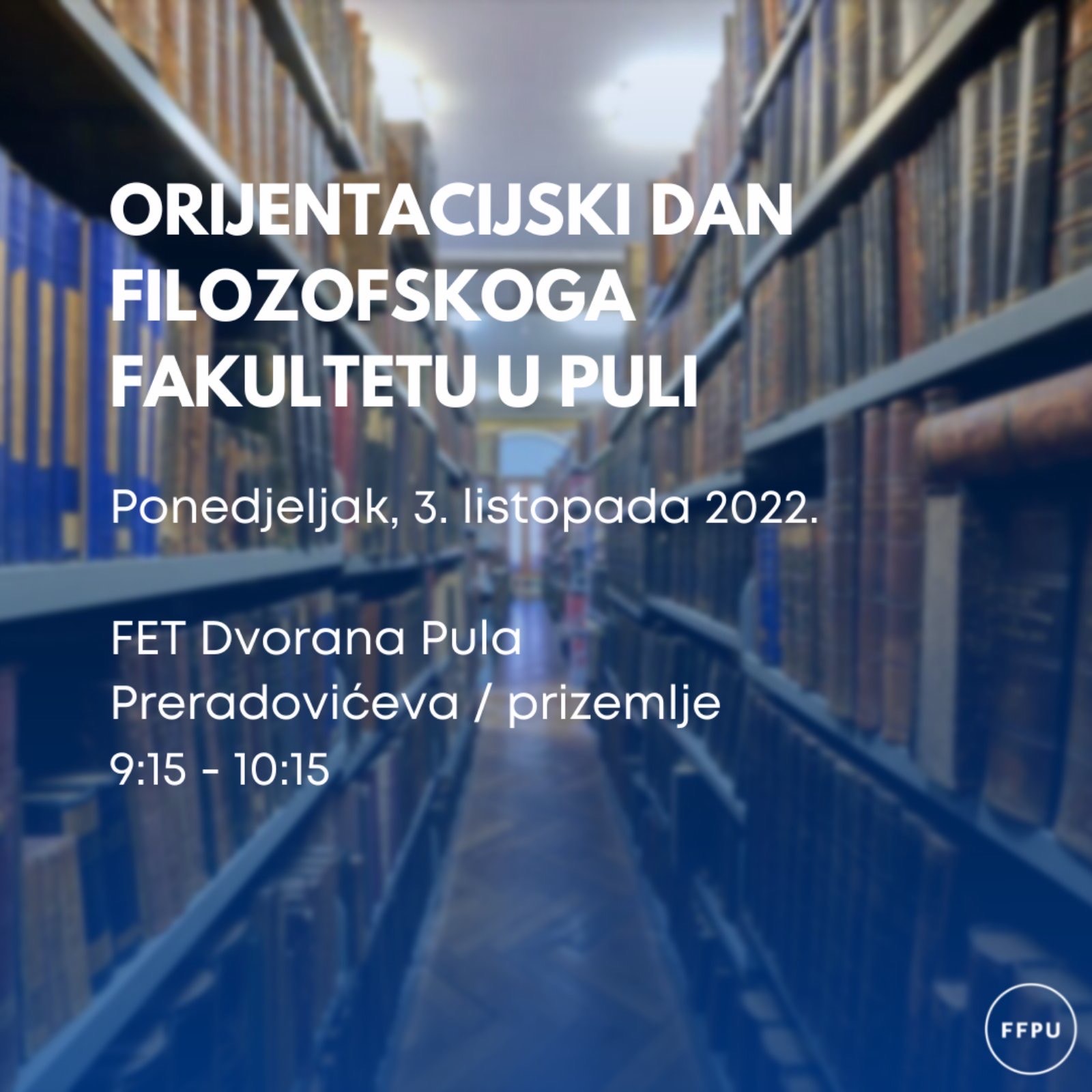 Orijentacijski dan za studente prve godine preddiplomskih studija Filozofskog fakulteta u Puli održat će se u ponedjeljak 3. listopada 2022. god. u 9.15 sati u dvorani „Pula“, zgrada FET-a, Preradovićeva 1 (prizemlje), a nastava započinje 4. listopada 2022. godine prema rasporedu predavanja objavljenom na mrežnim stranicama (https://ffpu.unipu.hr/ffpu/za_studente/raspored_nastave ).