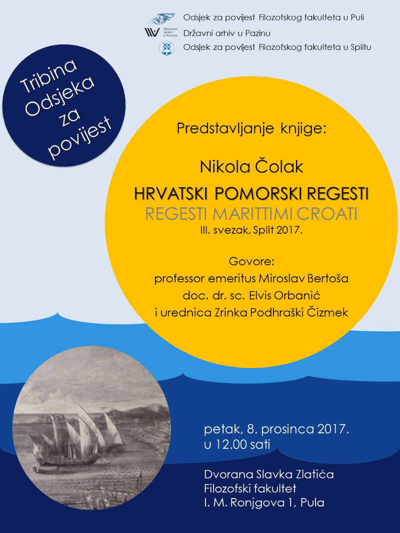 Poštovani, zadovoljstvo nam je pozvati Vas na Tribinu Odsjeka za povijest Filozofskoga fakulteta u Puli. Odsjek za povijest, državni arhiv u Pazinu i Odsjek za povijest Filozofskog fakulteta Sveučilišta u Splitu organiziraju predstavljanje knjige Nikole Čolaka Hrvatski pomorski regesti - Regesti marittimi Croati (3. svezak), Split 2017.