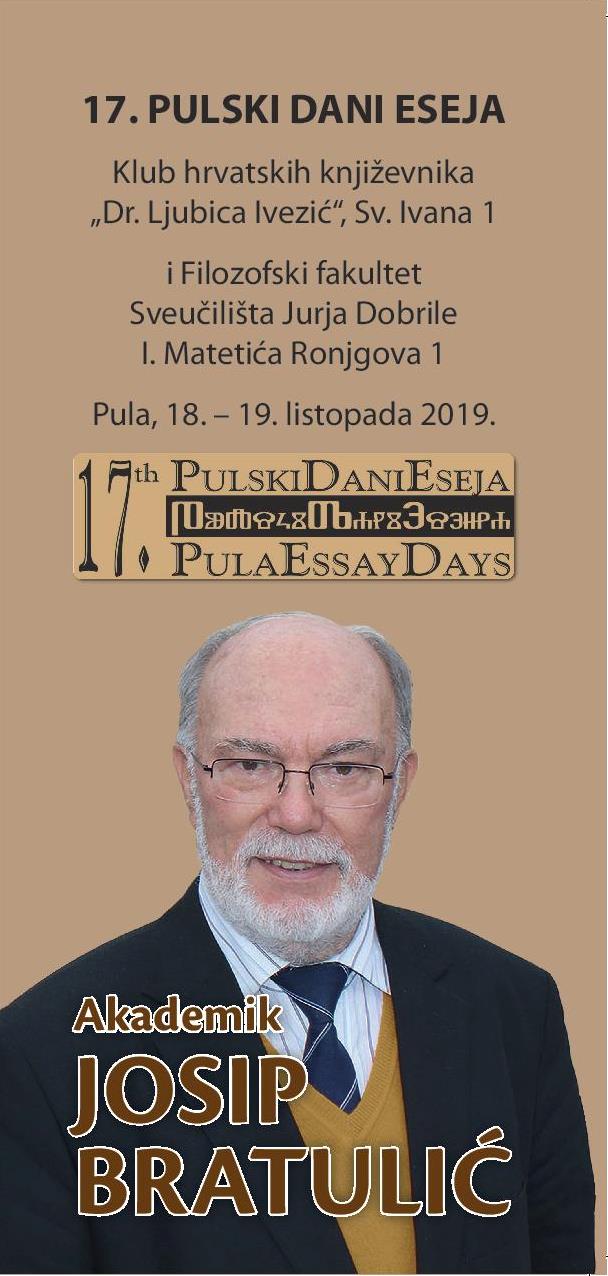 Pozivaju se profesori i studenti da se pridruže otvaranju 17. Pulskih dana eseja, posvećenih obilježavanju 80 godina života akademika Josipa Bratulića. Program započinje u petak 18. listopada 2019., u 11.30 sati, u Svečanoj dvorani "Tone Peruško".