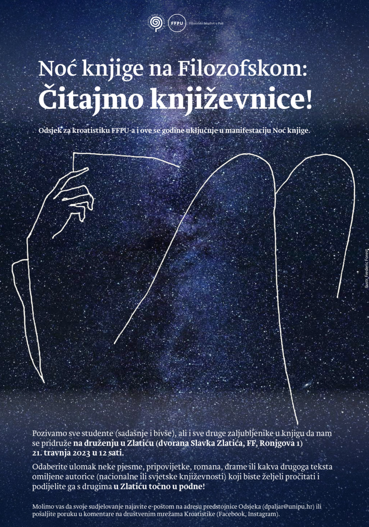 Odsjek za kroatistiku u Puli i ove se godine uključuje u manifestaciju Noć knjige. Pozivamo sve studente (sadašnje i bivše) svih smjerova i sve druge zaljubljenike u knjigu da nam se pridruže na druženju u Zlatiću (Dvorana Slavka Zlatića, dv. 11 Filozofskoga fakulteta, Ronjgova 1) 21. travnja 2023. u 12 sati.