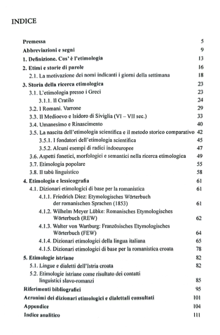 Knjiga je posvećena talijanskoj etimologiji i obuhvaća povijest etimoloških istraživanja od antičke Grčke pa do danas, nastanak znanstvene discipline i njezine predstavnike, bavi se pitanjima metodologije, prikazuje najbitnije etimološke rječnike za romanistiku i za talijanistiku i donosi mnoštvo primjera, ne samo za  talijanski jezik nego i za Istru, istaknuvši dragocjenost istarskih dijalekata i njihova prožimanja. Knjiga je primarno namijenjena studentima talijanistike i filolozima, talijanistima, romanistima i jezikoslovcima, dijalektolozima, kao i široj publici koja promišlja o podrijetlu riječi i njihovoj povijesti.