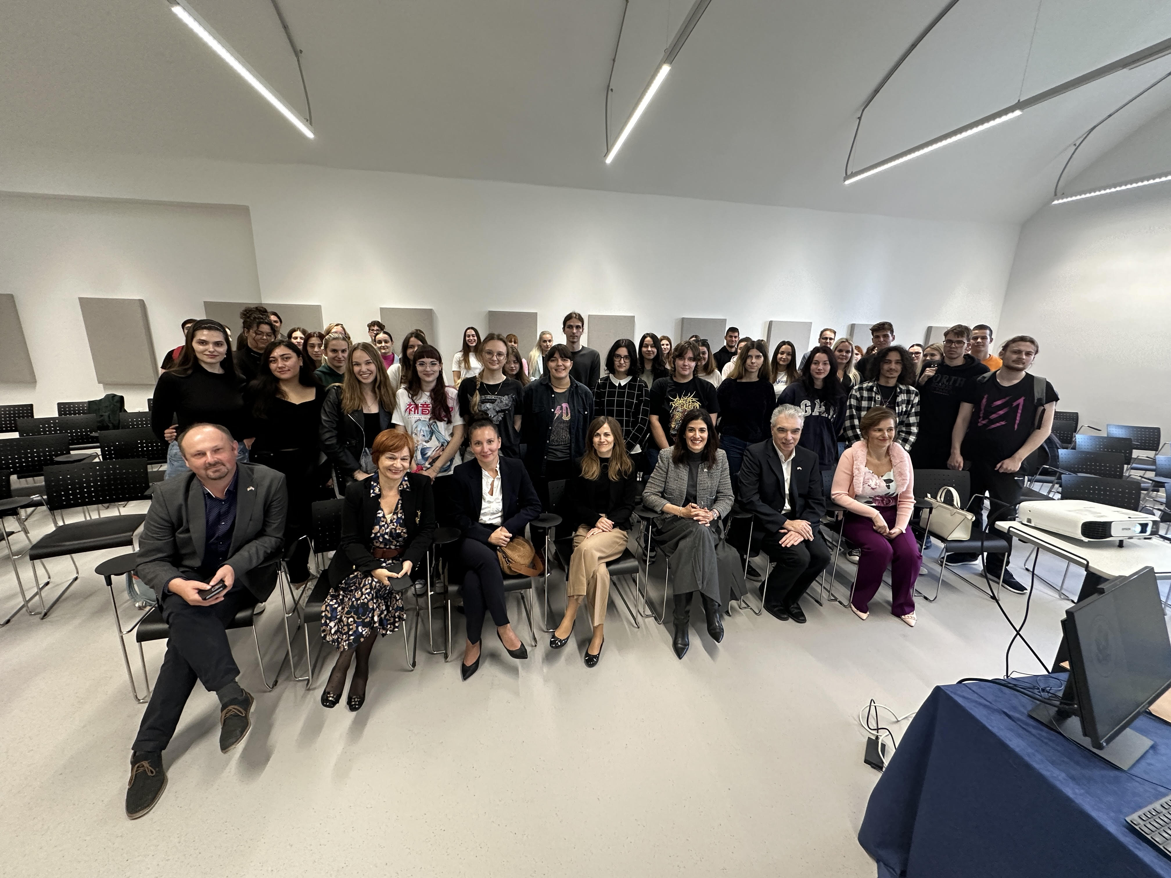 Nakon susreta s rektorom i njegovim timom, veleposlanica je održala kratko predavanje o svojoj karijeri, zadacima i ciljevima kao veleposlanice u RH te je odgovarala na mnogobrojna pitanja studenata. Dvorana je bila puna studenata s anglistike, koji su pokazali veliki interes za razgovorom, postavljali zanimljiva, često i složena pitanja, zbog čega je veleposlanica bila više nego zadovoljna.