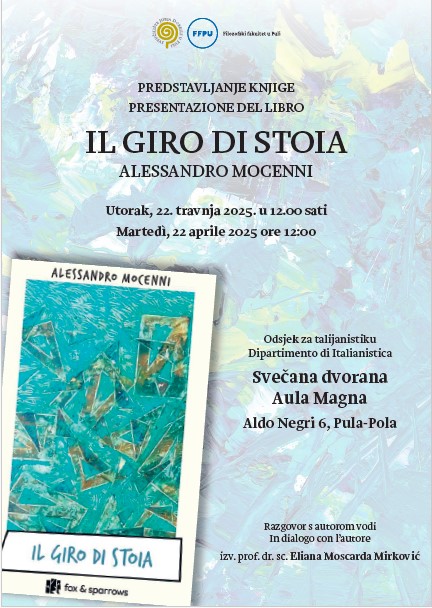 Odsjek za talijanistiku Filozofskog fakulteta Sveučilišta Jurja Dobrile u Puli sa zadovoljstvom poziva studente, nastavnike i sve zainteresirane na predstavljanje romana Il giro di Stoia talijanskog književnika i novinara Alessandra Mocennija, koje će se održati u utorak, 22. travnja 2025. u 12:00 sati u Svečanoj dvorani (Aula Magna).