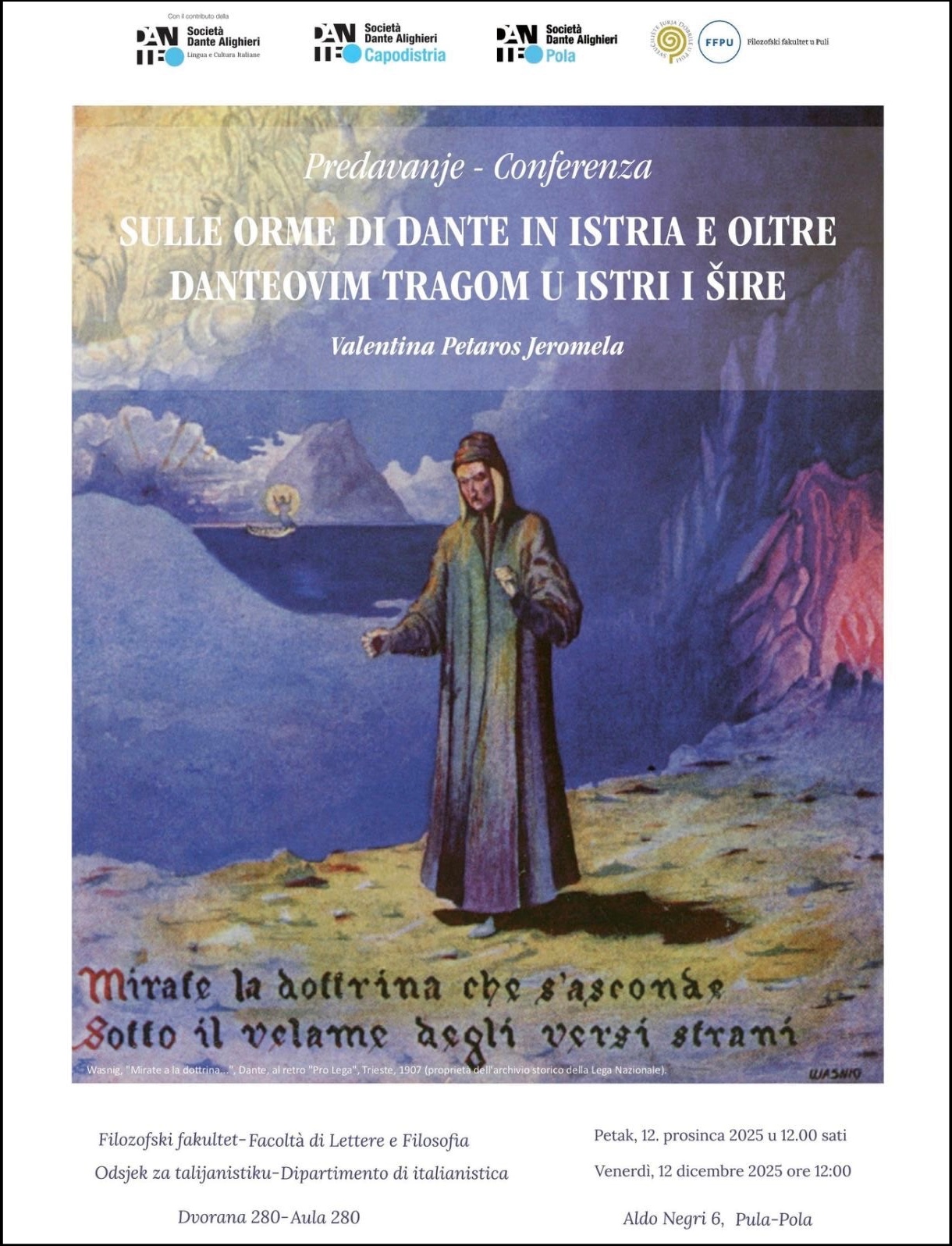 Odsjek za talijanistiku poziva sve zainteresirane na predavanje Sulle orme di Dante in Istria e oltre (Danteovim tragom u Istri i šire), koje će se održati u petak, 12. prosinca, u 12:00 sati u dvorani 280 (ul. Aldo Negri 6, 1. kat).