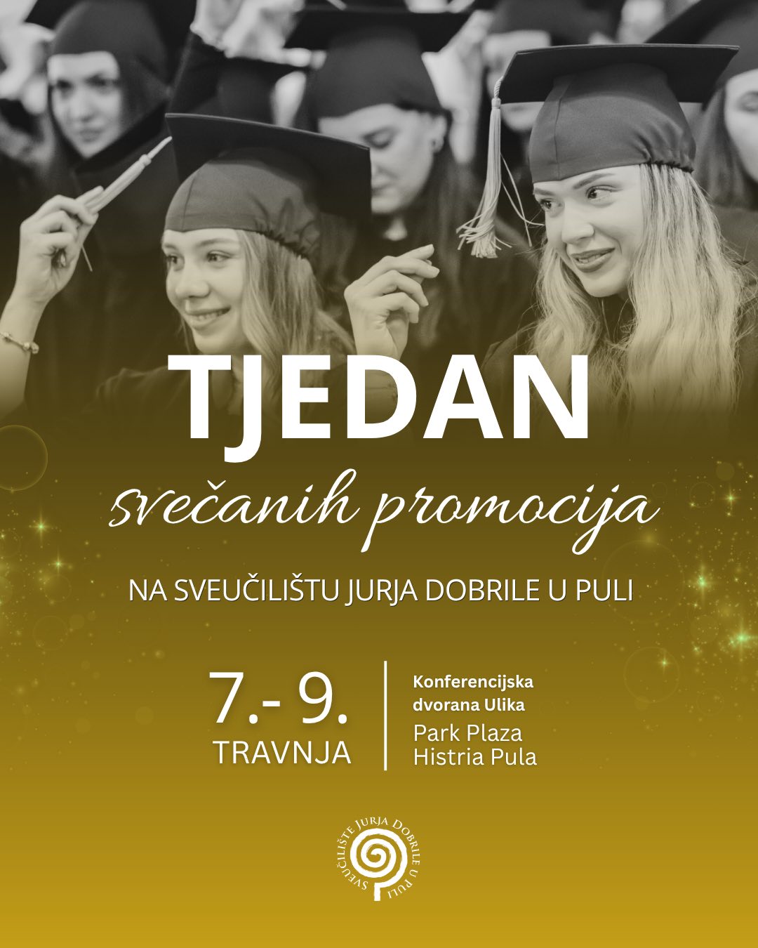 Na Sveučilištu Jurja Dobrile u Puli od 7. do 9. travnja održavaju se svečane promocije diplomiranih studenata i studentica u Konferencijskoj dvorani Ulika, Park Plaza Histria Pula. Pozivamo sve diplomante i diplomantice da se odazovu na svečanu promociju 7. travnja 2026. u 10:30, a svečanost započinje u 11:30 sati.