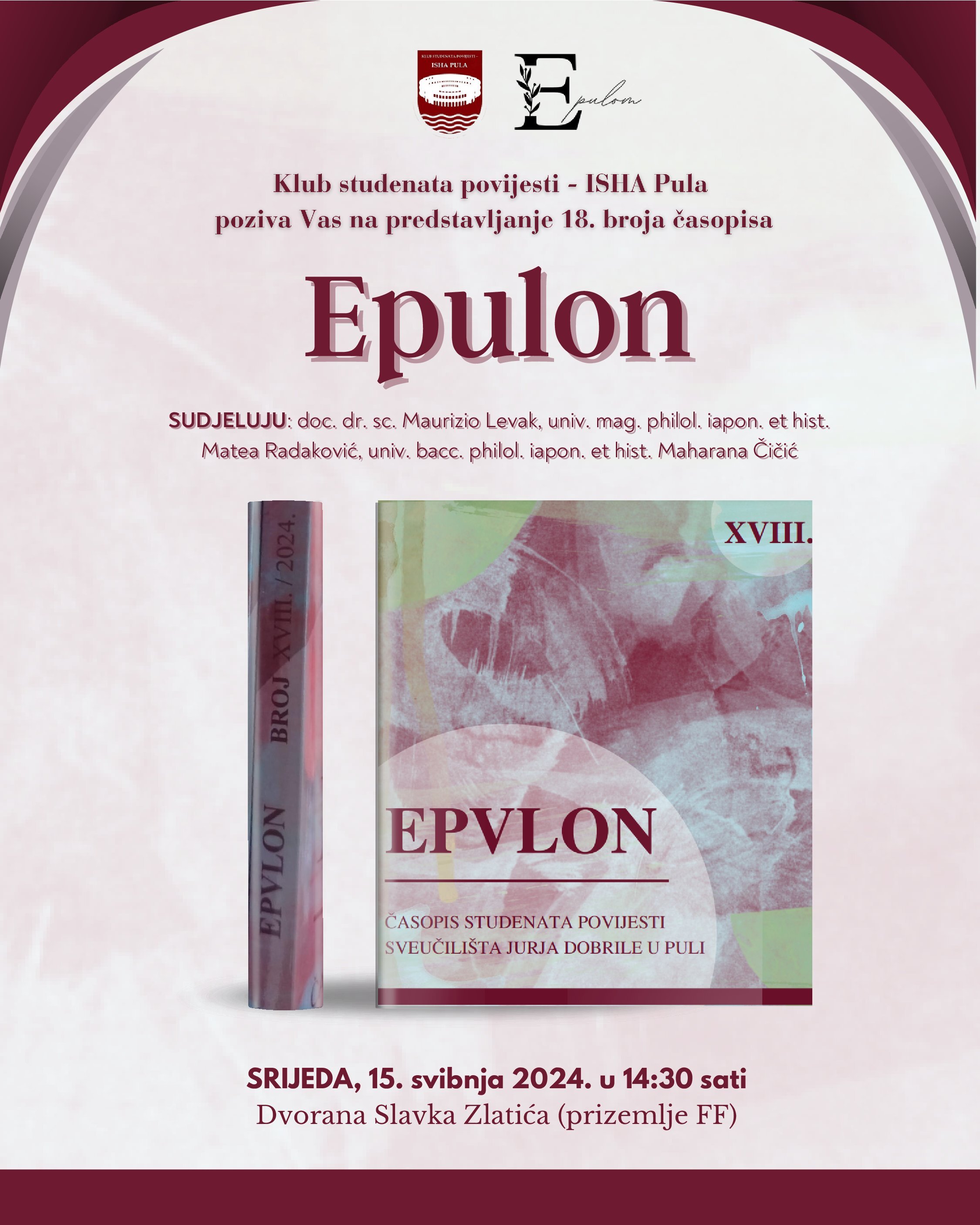 U srijedu, 15. svibnja 2024., s početkom u 14:30 sati u Dvorani Slavka Zlatića (prizemlje Filozofskog fakulteta) održat će se predstavljanje 18. broja Epulona, časopisa Kluba studenata povijesti - ISHA Pula. Časopis će predstaviti doc. dr. sc. Maurizio Levak, predstojnik Odsjeka za povijest,  te članovi uredništva Matea Radaković, mag. philol. iapon. et. hist., i Maharana Čičić, univ. bacc. philol. iapon. et. hist.