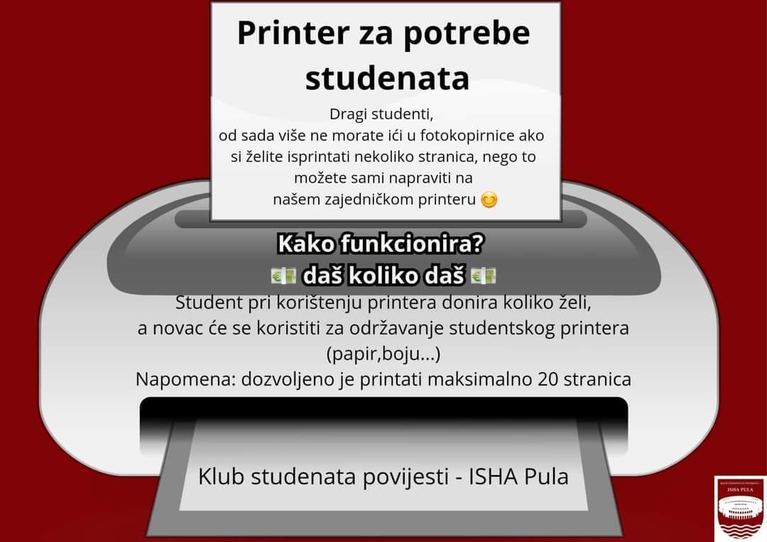 Klub studenata povijesti - ISHA Pula omogućio je printer i skener za potrebe studenata Filozofskog fakulteta. Printer se nalazi neposredno ispred knjižnice u zgradi fakulteta, a funkcionira po principu - daš koliko daš. Printer je spojen na laptop koji je od ranije na raspolaganju studentima. Molimo sve da se odgovorno ponašaju prema zajedničkoj imovini.
