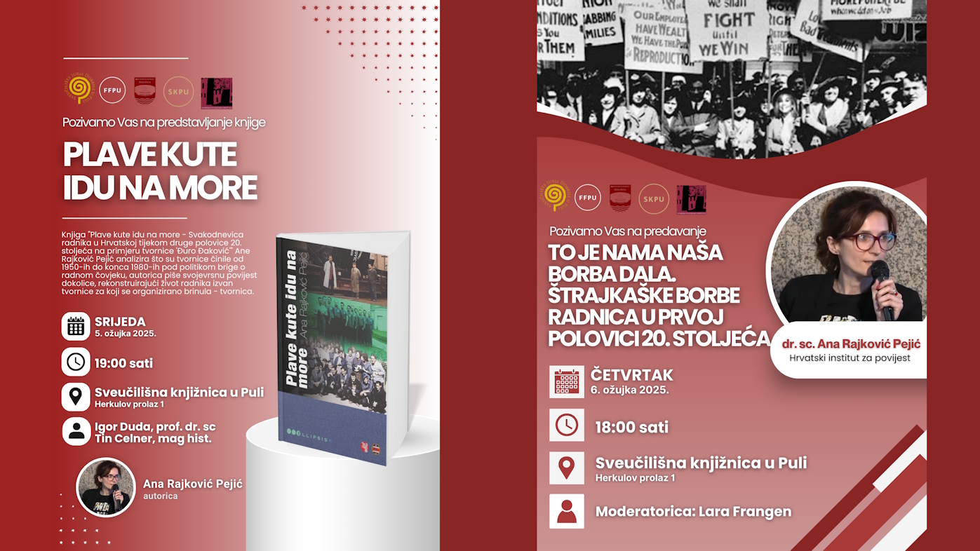 Predstavljanje knjige dr. sc. Ane Rajković Pejić Plave kute idu na more: Svakodnevica radnika u Hrvatskoj tijekom druge polovice 20. stoljeća na primjeru tvornice „Đuro Đaković“ održat će se u srijedu, 5. ožujka 2025., s početkom u 19:00 sati u Maloj čitaonici Sveučilišne knjižnice u Puli. Pored autorice, o knjizi će govoriti recenzent prof. dr. sc. Igor Duda s Odsjeka za povijest, a razgovor će moderirati Tin Celner, mag. hist., aktivan član Kluba studenata povijesti – ISHA Pula te bivši član Studentskog zbora.