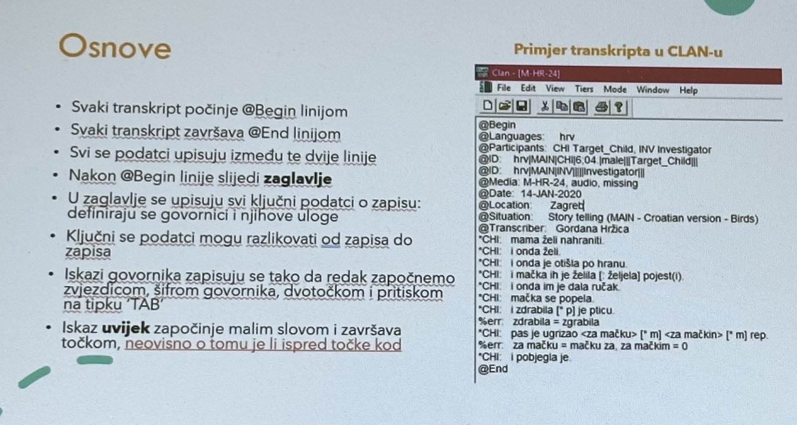 On Monday, 30 March 2026, within the activities of the Research Centre for the Linguistic and Cultural Heritage of Istria at the Faculty of Humanities of the Juraj Dobrila University of Pula, Dr. Sara Košutar (UiT The Arctic University of Norway) held an online specialised workshop entitled “Coding Principles in the CHAT System within the CLAN Program”.