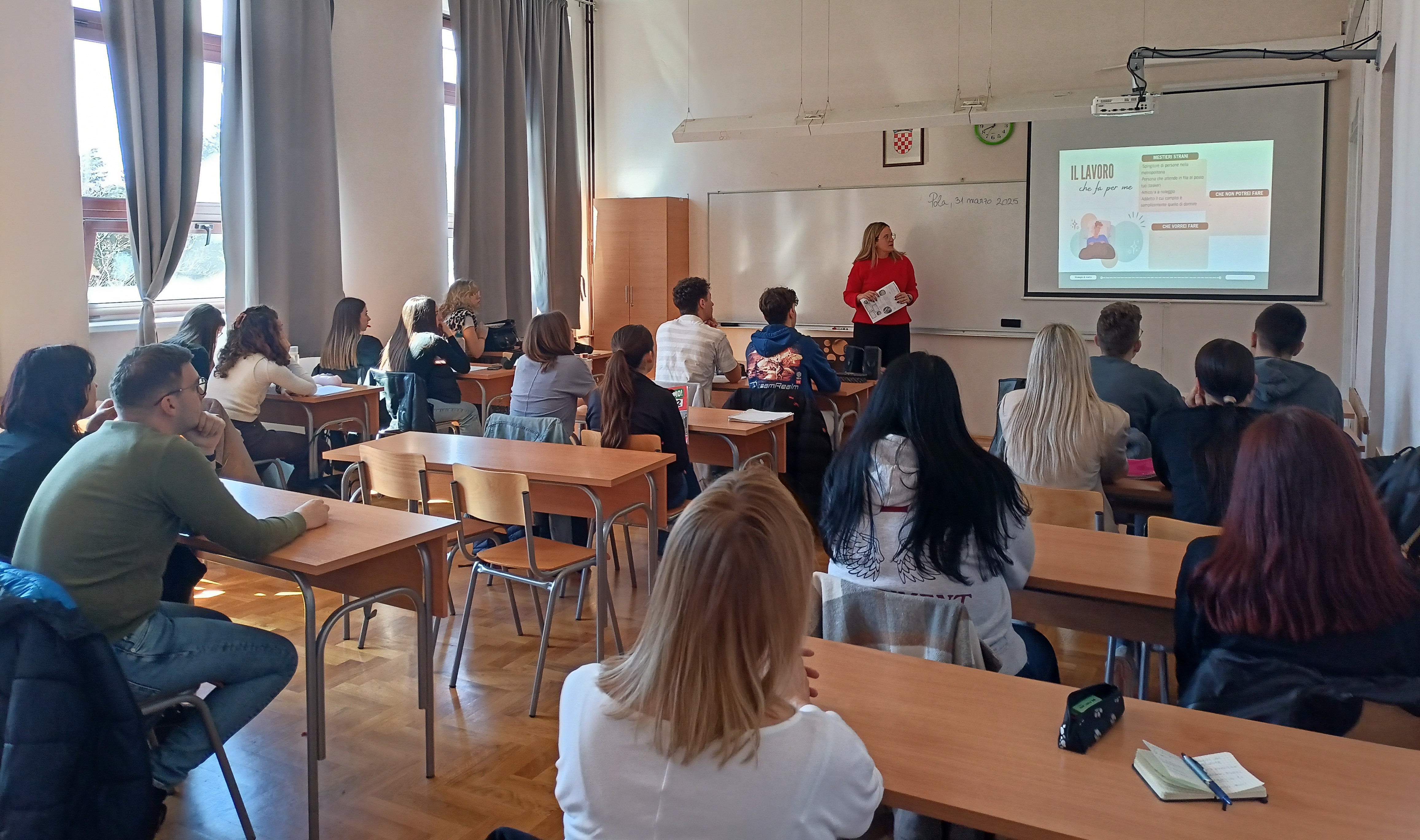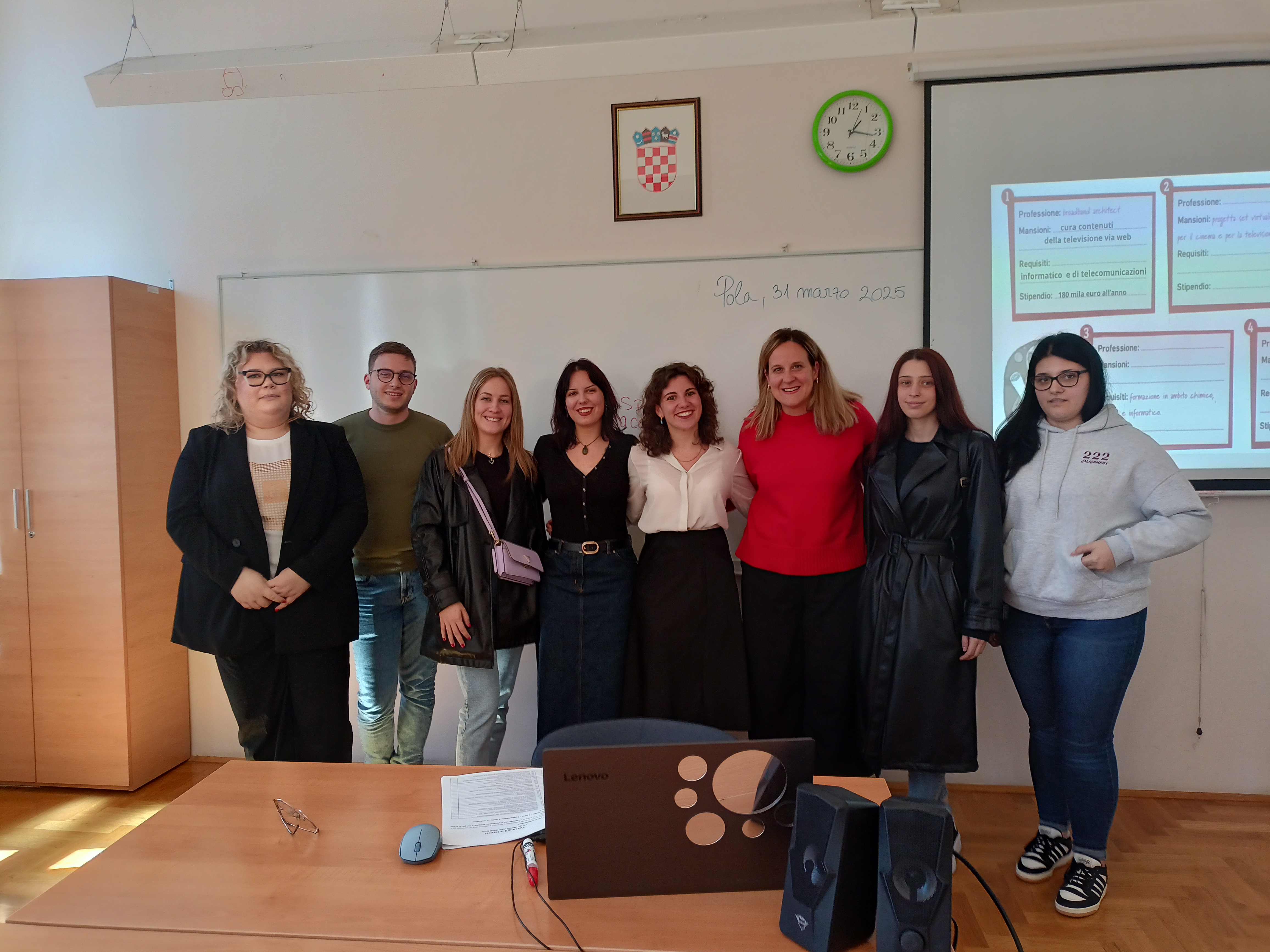Dana 31. ožujka su studenti s kolegija Metodika nastave talijanske književnosti prisustvovali oglednom satu o Tradicionalnim zvanjima i neobičnim zanimanjima u III C razredu Gimnazije Pula kod profesorice Paole Živolić Zec. Prvi je studentski posjet posvećen nastavi iz jezika, dok će drugi studentski posjet ovog semestra biti okrenut poučavanju književnog teksta te će se odviti u talijanskoj srednjoj školi.
