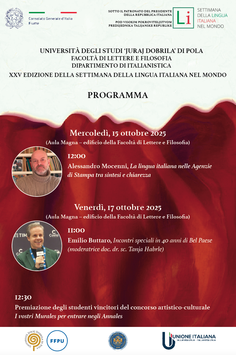 Nell’ambito della XXV Edizione della Settimana della Lingua Italiana nel Mondo, il Dipartimento di Italianistica della Facoltà di Lettere e Filosofia di Pola ha il piacere di invitarvi a una serie di eventi che si terranno il 15 e 17 ottobre 2025 presso l’Aula Magna (I piano, aula 246) del nuovo campus universitario (via A. Negri 6).