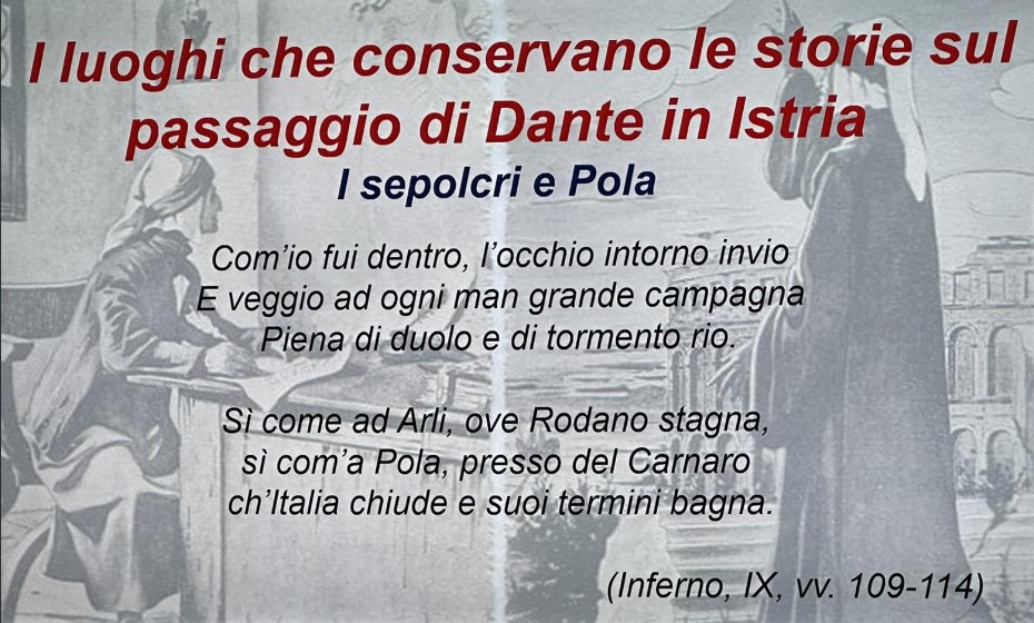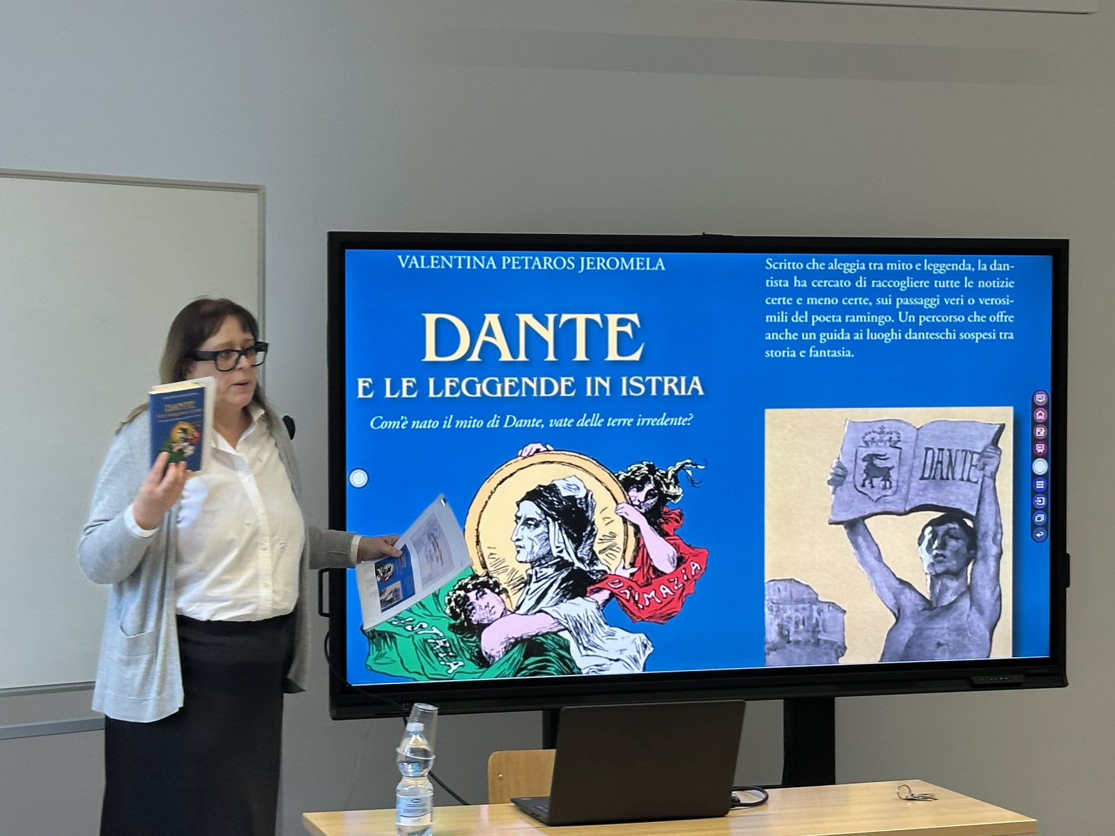 U petak 12. prosinca, Valentina Petaros Jeromela, predsjednica Društva Dante Alighieri iz Kopra, održala je studentima i profesorima Odsjeka za talijanistiku zanimljivo predavanje koje prikazuje rezultate dugogodišnjih istraživanja moguće povezanosti Dantea s istarskim područjem. Predavačica je razmotrila pisana svjedočanstva i legende koje sežu od srednjovjekovnih rukopisa do komentara Božanstvene komedije iz devetnaestog stoljeća. Spomenuto je nekoliko mjesta koja je Dante mogao posjetiti, među kojima se posebno ističe Pula, pri čemu se profesorica Petaros Jeromela osvrnula na dijelove grada koje je eventualno posjetio, a kao jedan od mogućih posrednika njegovog posjeta Puli navodi se Pagano della Torre. Tijekom predavanja spomenuta su i druga mjesta poput špilje u Tolminu, Cerkniškog jezera i Dantove hridi u Duinu. Istaknuta je povezanost obitelji Besenghi iz Izole (u Sloveniji) s obitelji Ughi iz Firence, koja se spominje u Raju Božanstvene komedije. Predavačica se također osvrnula na činjenicu da su dva važna kodeksa iz 14. stoljeća, onaj iz Marciane u Veneciji i Pariški kodeks Pietra Campennìja iz Tropee, vjerojatno napisana u Izoli. Na kraju predavanja naglašeno je da sve interpretacije, ma koliko one fascinantne bile, u nedostatku konačnih dokaza ostaju samo pretpostavke.