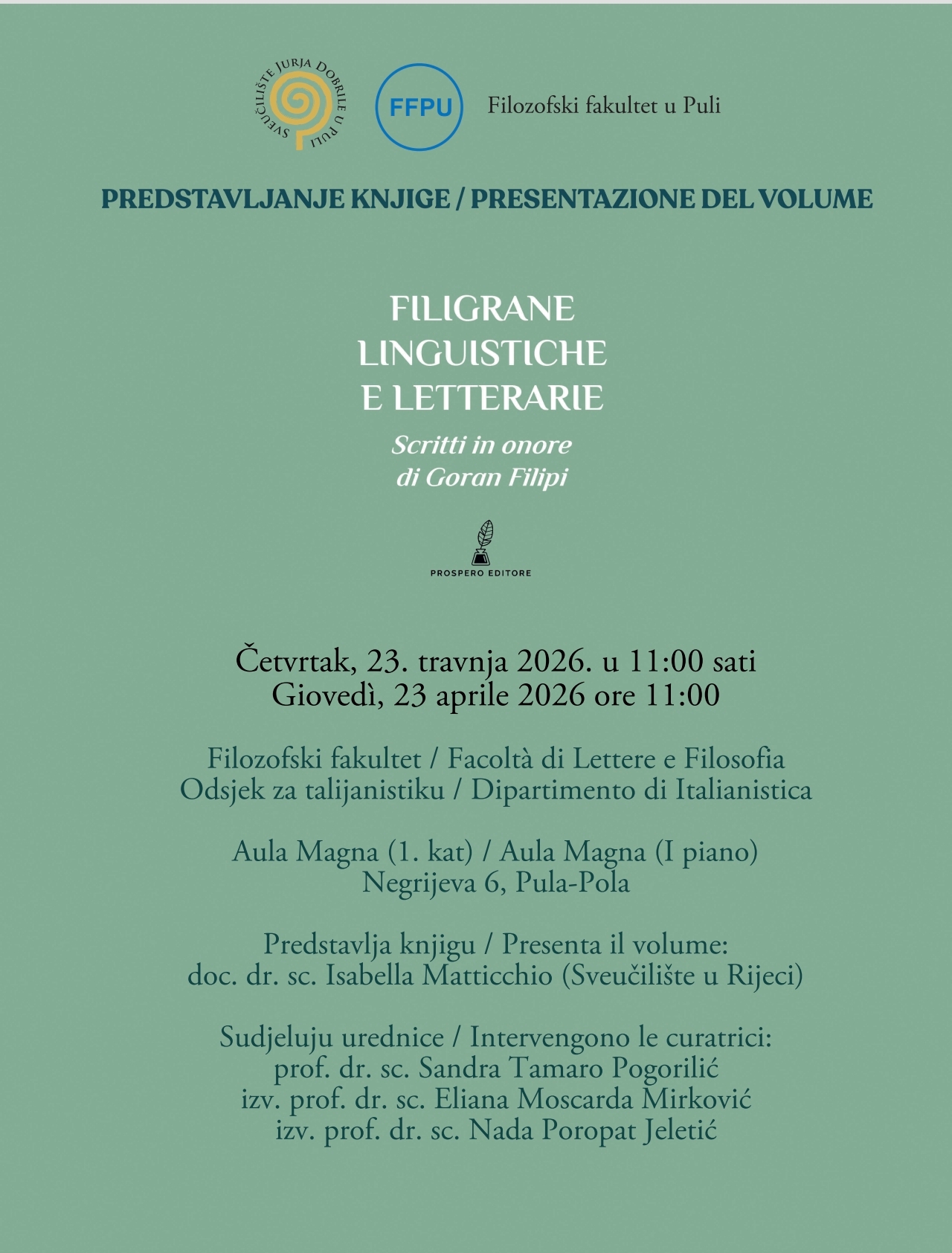 Il Dipartimento di Italianistica è lieto di invitarVi alla presentazione del volume "Filigrane linguistiche e letterarie. Scritti in onore di Goran Filipi", che si terrà giovedì 23 aprile 2026 alle ore 11:00 presso l’Aula Magna della Facoltà di Lettere e Filosofia (I piano, Via Aldo Negri 6, Pola).