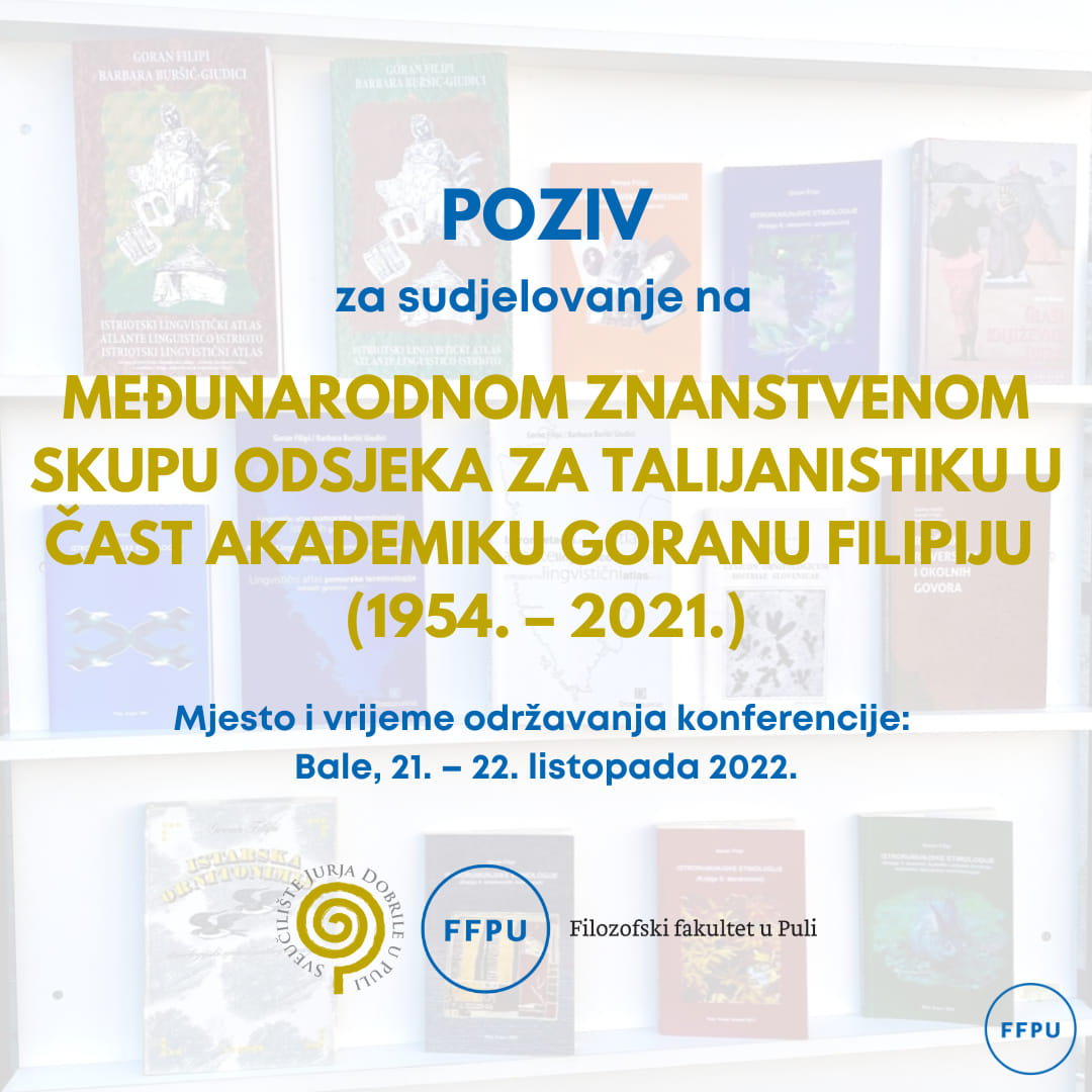 Odsjek za talijanistiku Filozofskoga fakulteta Sveučilišta Jurja Dobrile u Puli ima čast pozvati vas na sudjelovanje na Međunarodnom znanstvenom skupu talijanistike u spomen na nedavno preminuloga akademika Gorana Filipija. Doprinos profesora Filipija u području romanistike, kontakte dijalektologije i etimologije te leksikografije ostvaren je nizom značajnih monografija, lingvističkih atlasa i rječnika, a svi koji ga znaju sjećaju se njegove strasti i ljubavi prema manjinskim jezicima, pogotovo prema istrorumunjskom.