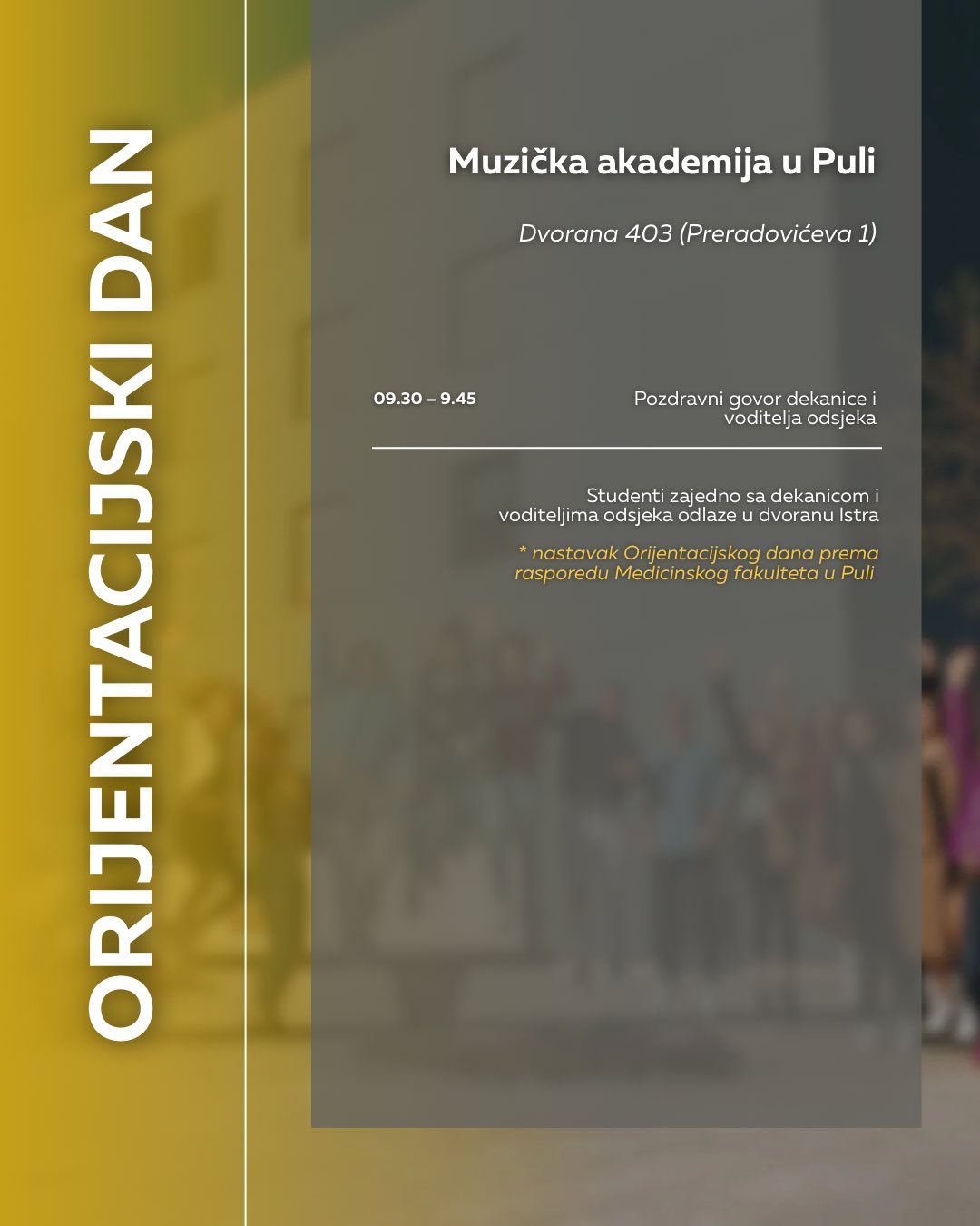 NAPOMENA: Obratite pozornost na adrese događaja, za pojedine fakultete Orijentacijski će se dan održati u novom kampusu na adresi Negrijeva 6, gdje se nastava tih fakulteta i izvodi.